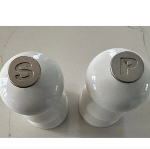 Elegant white salt and pepper grinders with silver tops. Perfect for any dining table.