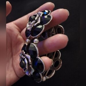 This Awesome Chunky bracelet with black floral design and silver accents is a real Statement piece. 4 flowers total makes up the entire bracelet. Stretchy, but measurements included in photo. All questions welcome.