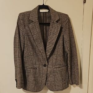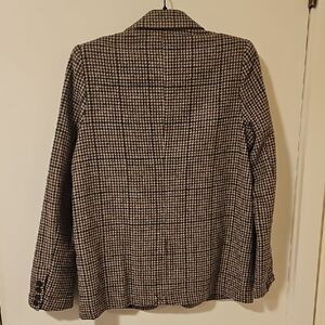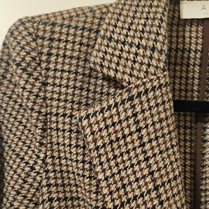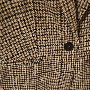 scholarly houndstooth blazer in brown, tan, and dark green, single button. Warm, good for layering. looks great with jeans!