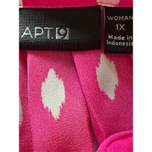 Keywords: Apt 9, APT.9 blouse, women’s plus size, 1X top, pink blouse, sleeveless top, V-neck blouse, ikat print, geometric print, pleated back, lightweight drape, relaxed fit, rounded hem, pullover top, polyester blouse