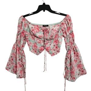 Floral Pink Puff Long Flare Sleeve Self Tie Front Crop Corset Top. Size Large