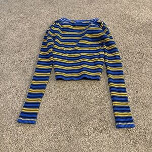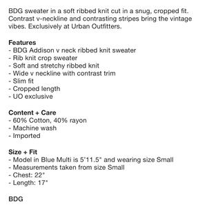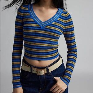 BDG sweater in a soft ribbed knit cut in a snug, cropped fit. Contrast v-neckline and contrasting stripes bring the vintage vibes. Exclusively at Urban Outfitters.