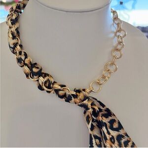 Elegant gold and black chain necklace with a stylish leopard print accent. Perfect for adding a touch of sophistication to any outfit.