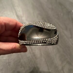 Elegant silver bangle bracelet adorned with sparkling rhinestones. Perfect for adding a touch of glamour.