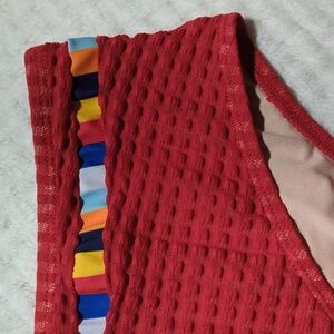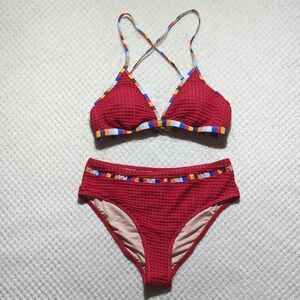 Cupshe Waffle Knit Cross Back Triangle Top & Hipster Bikini Bottoms Set. Size medium. NWT, never worn, no damage, hygienic liner is attached. Bright red color with multicolored straps and trim. Texture all over. Triangle top has adjustable tie straps and removable padding. Bottoms are hipster cut with cheeky coverage. Buttery soft.
