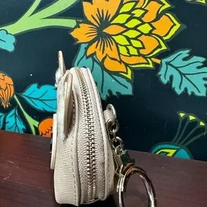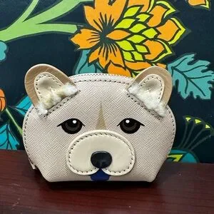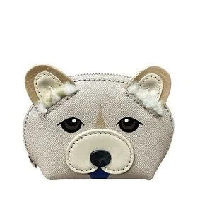 Playful Kate Spade novelty coin purse featuring an adorable dog face design in textured light beige leather. Finished with appliqué ears and snout, embroidered facial details, and a secure zip-top closure. Includes a metal key ring and chain—perfect for attaching to keys or a handbag as a charm.