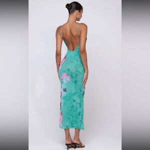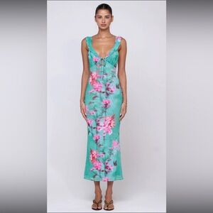 Elegant Green and Pink Floral Midi dress with vibrant floral design in sheer mesh fabric. Features a deep V-neck and adjustable tie front. Perfect for any occasion.