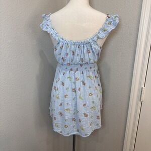 The Out From Under Lilly Babydoll Y2K Top in L Blue Fruit Novelty is a trendy and feminine tank top perfect for casual occasions. Made from a blend of viscose and cotton with a gauzy fabric type, this top features a square neckline, wide straps, and accents like ruffles and bows. The Milkmaid theme combined with elements of beach, princess, coquette, and retro style make it a fun and lightweight option for the summer, fall, and spring seasons. This pullover top from Urban Outfitters offers a regular fit for a comfortable and breathable wear.