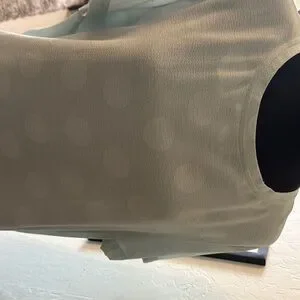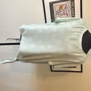 This green blouse by Donna Karan features a relaxed fit with a stylish tie front, perfect for casual wear. The short sleeves and simple round neckline add to its versatile appeal, making it a great addition to any wardrobe.