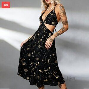 Brand new, never worn, and in flawless condition — this stunning celestial maxi dress delivers an enchanting, elevated look perfect for special evenings, festivals, or making a bold statement on vacation. The drape is soft, flowing, and incredibly comfortable.