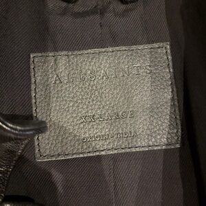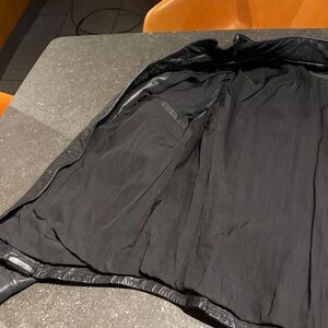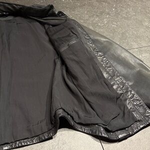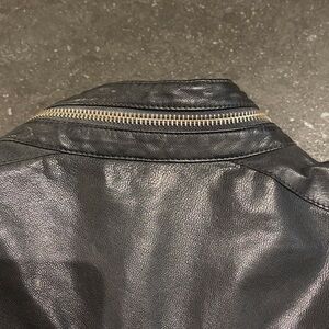 Sleek black leather jacket with button details. Features chest pockets and a classic collar. Ideal for layering. it has a shirt jacket style but it's a little thicker. Has one small mark on the right arm shown in pictures and a little bit of discoloration also shown in pictures. Price is adjusted based on that. It's a really stylish great jacket!