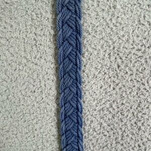 Pre-owned men’s Vineyard Vines blue cable knit belt with brown leather tips size 42. Blue cable twist area is faded but belt is still structurally fine. Approximately 46” long