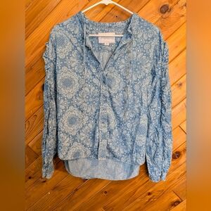 The Shirt by Rochelle Behrens Blue Patterned Button Down Size Small