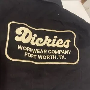 Black long sleeve shirt with embroidered logo. Button-up front. Iconic Dickies style.