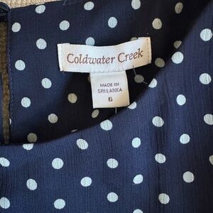 Classic, feminine Coldwater Creek dress in a navy blue polka dot print with a softly draped silhouette.
