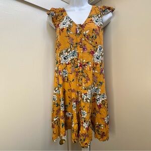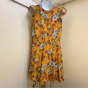 Charming yellow dress with a vibrant floral pattern. Perfect for a sunny day. Ruffle sleeves.