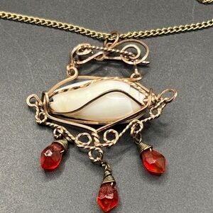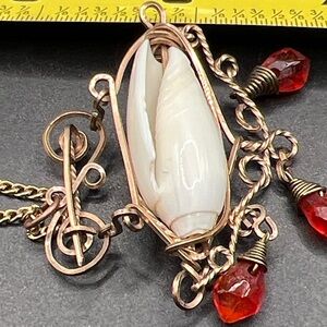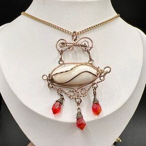 Vintage wire wrapped seashell pendant with dangling red beads on 16” chain. Can also be worn as a brooch