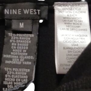 This Nine West black skirt in size Medium features a sleek design with belt loops, a clasp closure, and zip and button accents. Made from a blend of polyester, spandex, and rayon, this knit skirt is perfect for various occasions such as travel, weddings, parties, formal events, and business meetings. The skirt has a straight and pencil style with a short length and slit detail, making it suitable for all seasons. With a preppy and bohemian theme, this skirt is a versatile and stylish addition to any woman's wardrobe.