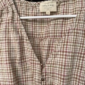 Elegant plaid blouse with button front. Features puff sleeves and delicate ruffles. Ideal for stylish outings.