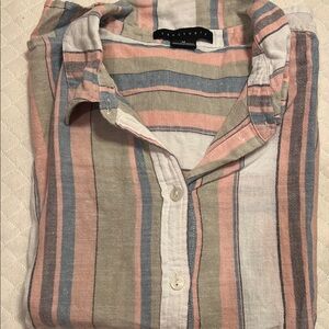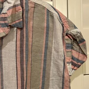 Casual button down with multicolor stripes. Short sleeves and classic collar. Sits at the waist. Ideal for everyday wear.