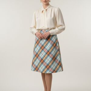 Add a touch of retro charm to your wardrobe with this authentic vintage A-line skirt from Sears Perma-Prest. Featuring a beautiful multi-color plaid pattern in shades of orange, blue, teal, and tan, this piece is a classic example of mid-century American style.