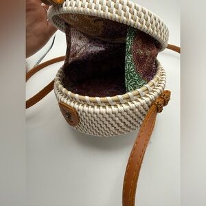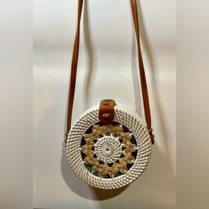 Boho round crossbody purse white & tan woven, EUC