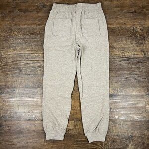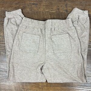 Soft and cozy Moon River slouchy knit jogger pants in a neutral heathered beige tone. These feature a comfortable elastic waistband with a chunky rope drawstring finished with tassels, functional front and back pockets, and elastic cuffs for an easy, relaxed silhouette. Perfect for lounging, travel, or casual everyday wear.