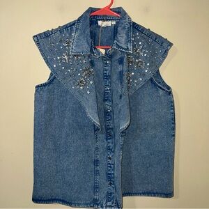 NWT Anthropologie Let Me Be Denim Rhinestone Vest Flutter Sleeve Embellished Top