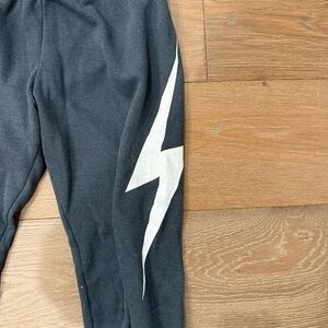 Stylish Aviator Nation joggers with a bold white lightning bolt. Ideal for play and casual outings.