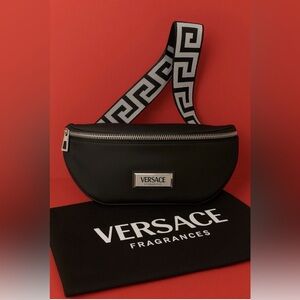 Versace Black Geometric Belt Bag with Adjustable Strap.
