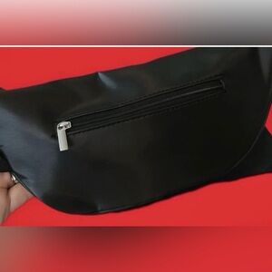 Elegant black belt bag with silver zipper. Features iconic strap design.
