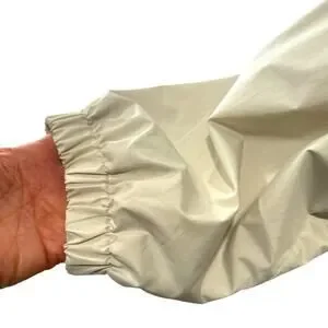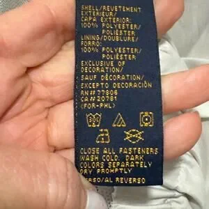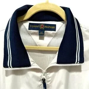 Excellent, preowned condition lightweight polyester, golf style, zip front jacket by Tommy Hilfiger is ecru colored. Elasticized wrist at long sleeves. And elasticized at hips. Two sides, zipper pockets. Mesh lining. Lightweight polyester. Black knit collar has two light colored stripes. Measurements are taken flat and are approximate.