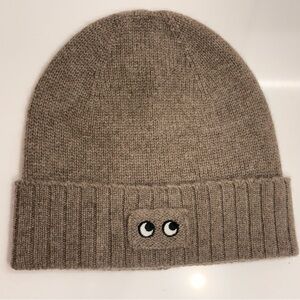 Stylish Anya Hindmarch Uniqlo collab beige 100% cashmere knitted beanie hat tuque beanie from Uniqlo. Features playful eye design. Perfect for warmth and style.