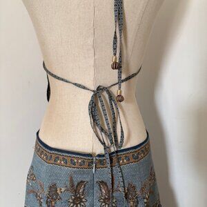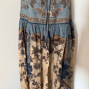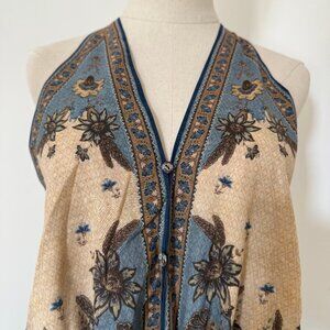 Zimmermann cotton dress Printed, plunge V-neck, tie-fastening strap at halterneck and back, button fastenings through front, draped detail at waist, front splits at hem, partially lined Concealed hook and zip fastening at back 100% cotton Dry clean.
