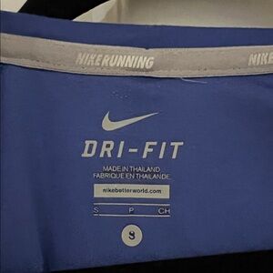 Elevate your activewear with this Nike Dri-fit short sleeve tee. Features a stylish two-tone blue design. Ideal for workouts or casual outings. Small mark on the front, otherwise great condition.