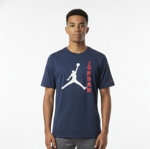 Elevate your style with the Jordan Men's Navy T-Shirt. Featuring a bold design, this shirt is perfect for casual outings. Experience comfort and fashion with this iconic piece.