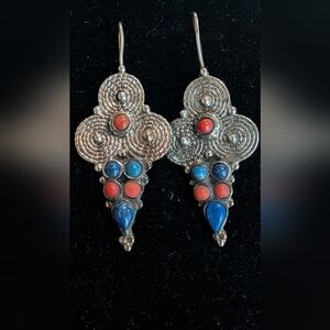 Elegant silver dangle earrings featuring striking blue lapis lazuli and red orange coral. Perfect for adding a touch of sophistication to any outfit.