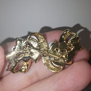 This stunning brooch features a beautiful combination of gold and thermoset gray tones, perfect for adding a touch of elegance to any outfit. Its unique design makes it a standout piece in any jewelry collection.