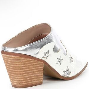From Betsey Johnson, the Denniss Embellished Patent Western Mules feature: