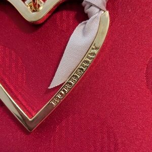 Elegant Burberry keychain featuring a gold heart design with a charming pink ribbon accent. Perfect for adding a touch of luxury to your accessories.