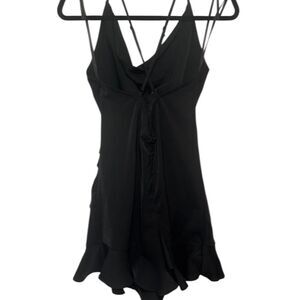 She + Sky Black silk mini romper with cowl neck and ruffle hem