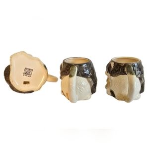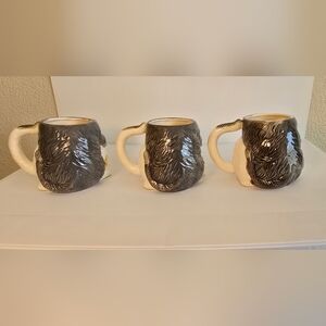 Set of three cat shaped ceramic mugs. Features black, white, and tan colors. Perfect for cat lovers.