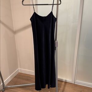 Vince slip dress in a rich midnight blue silk with a soft, fluid drape. Minimalist and elegant with a flattering V-neckline, adjustable spaghetti straps, and a sleek straight silhouette that skims the body. Perfect worn alone for evening or layered under knits and blazers year-round.