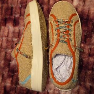 EUC; These are from my personal collection, 😅🤷♀️ bought from Hey Dude directly, worn maybe 3 times for a couple hours. I have a huge amount of shoes and get bored with them after wearing them a couple times!🙃 They have been washed and sanitized by me. I do not list anything without cleaning them as thoroughly as possible. Especially the white walls, insoles, and bottoms of the shoes. These are very comfy and have such a cute pattern and color pallet.