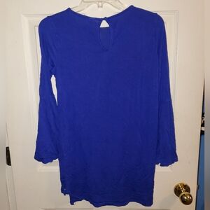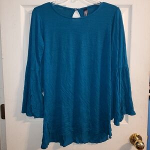 • Set of two straight silhouette tunic blouses with quarter bell sleeves that has split flounce, round neckline, keyhole detail and button closure on back neckline, and side slit vents. Hits below the hips, has stretch, and 3/8" button.