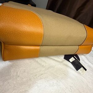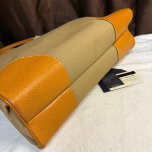 Elegant Prada tote with orange leather accents. Features sturdy handles and a roomy interior. Ideal for a busy office work , or any corporate use. Pre loved shows signs of use. Please refer to the photos for better view of the bag . Authenticity card included. . 14x14.5x4.5 bag drop 6”