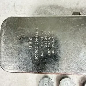 Attachment is marked "U.S.A. 160506 COMPLETE" with patent numbers visible. Templates show consistent age-appropriate patina and are original matching pieces. Case shows typical vintage wear but closes properly and displays well.