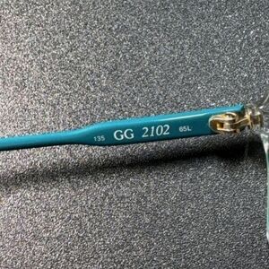 These are Gucci Vintage GG 2102 eyeglasses frames. The specific color shown is a clear frame with green/teal temples and accents.