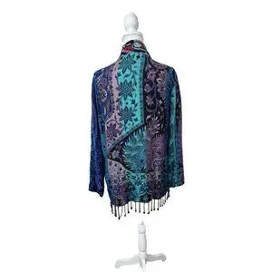 This Soft Surroundings sweater is a must-have for any fashion-forward woman. The multicolor paisley pattern is beautifully embroidered on a tight-knit cardigan that features long sleeves and an open fringe design. The sweater is made of a soft and comfortable blend of rayon and wool, making it perfect for any season.