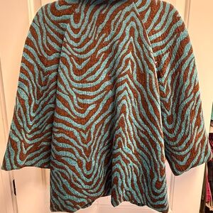 Make a statement in this vintage Painted Pony jacket! Featuring a bold brown + turquoise zebra print, this unique piece is Made in the USA and has an artsy, Southwestern vibe. Designed with an oversized collar and decorative square button closures, it’s the perfect lightweight jacket to dress up jeans or add flair to any outfit.